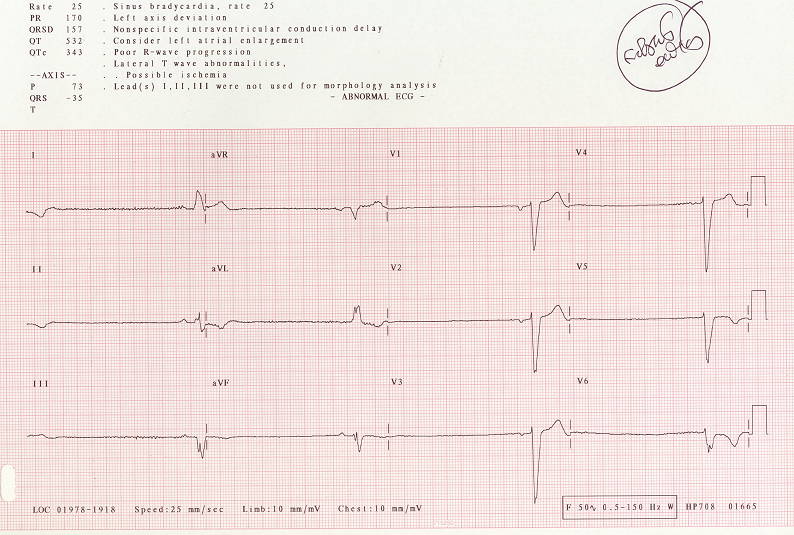 Προοδευτικά, όμως, επιδεινώθηκε η λειτουργική του κατάσταση, έως ότου εκδηλώθηκε κλινική καρδιακή ανεπάρκεια [ΝΥΗΑ ΙΙΙ], με ευρήματα χαμηλής παροχής – λ.χ. αύξηση των BUN/Cr. Ο υποκείμενος ρυθμός, χωρίς βηματοδότηση, ήταν φλεβοκομβικός με έντονη βραδυκαρδία και διαταραχή της ενδοκοιλιακής αγωγής –