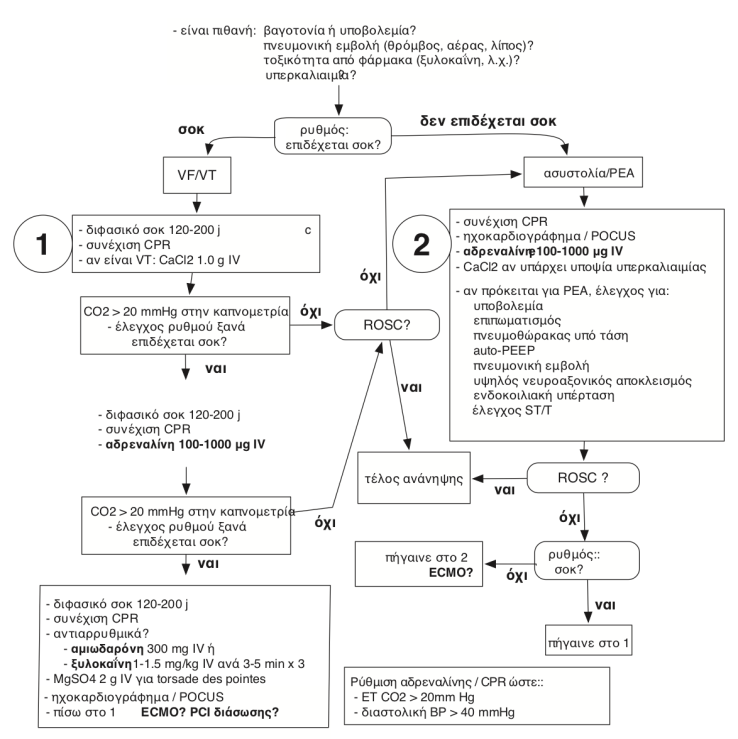 Πίνακας 1. Καρδιοαναπνευστική αναζωογόνηση στο περιβάλλον της χειρουργικής αίθουσας (ελαφρά τροποποιημένο από: Moitra VK, Einav S, Thies KC et al. Cardiac Arrest in the Operating Room: Resuscitation and Management for the Anesthesiologist: Part 1. Anesth Analg. 2018;126:876-888.) CPR καρδιοαναπνευστική αναζωογόνηση, ROSC επαναφορά αυθόρμητης κυκλοφορίας